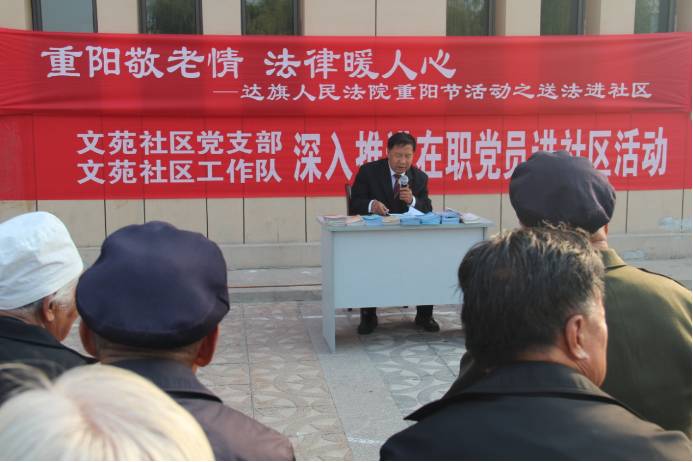 2015年,法院扎实开展“千名法官下基层”活动,先后多次组织开展了包扶村定点包扶、院党组成员一对一包扶、模拟法庭进校园、送法进企业、送法进社区、成立法官姐姐普法课堂、关爱特殊儿童等活动。2015年,法院党员干警共走访群众1300余人次,开展法制宣传22场次,发放司法便民服务手册15000余份,通过走访化解纠纷368件,包扶资金总数达到数十万元。群众反映说,法官下基层,法院离群众近了,法官和群众亲了。今年5月28日,达旗人民法院成功举办道德讲堂。本次道德讲堂,不仅提升了干警的道德修养,更通过讲堂中的“博爱一日捐”活动,体现了干警对社会的责任与爱心,全院捐款总数达到22100元。目前,道德讲堂活动已经成为法院的一项常态化工作。