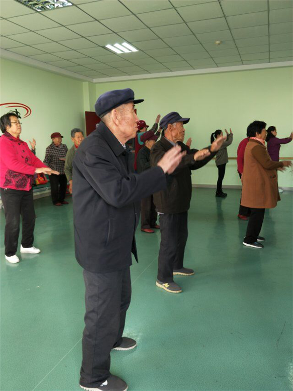 每天早晨,社工带领老年人一起做医疗保健操,活动筋骨,锻炼身体。