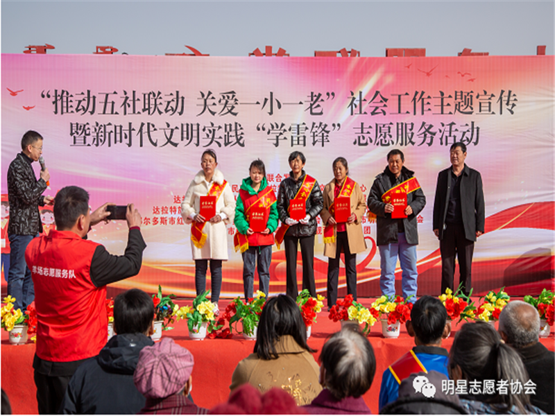 为深入贯彻落实习近平总书记关于民政工作的重要指示批示精神和党的二十大精神,落实达拉特旗“五社联动”项目要求,加强基层治理体系和治理能力现代化,推动“五社联动”助力“一小一老”志愿服务,3月11日,在达拉特旗民政局支持下,达拉特旗新时代文明实践中心、达拉特旗昭君镇人民政府、达拉特旗昭君镇社工站、鄂尔多斯市明星志愿者协会等联合组织志愿者在昭君镇羊场村开展了“推进五社联动 关爱一老一小”社会工作主题宣传暨新时代文明实践“学雷锋”志愿服务活动。